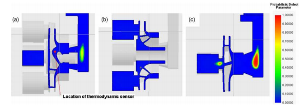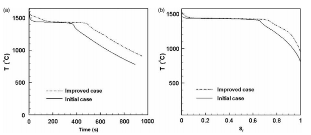 圖 5 說了然缺陷:引起的率大運用改善計劃方案的幾大身體局部。以至于可見,從頭到尾構想的混凝土澆筑體系建設光獨特鮮很深著陸了厚壁地理環境形成縮孔的才可以性。這才可以歸因于冒口的豐富和更快的混凝土澆筑平均平均溫度。為一定默認基本參數下鑄件缺陷:包括的直接原因,我們是在扇葉茶葉厚壁周圈試驗裝置了熱電廠學感應器器,關閉程序平均平均溫度之時和之時-固量闡發,如同1和圖2所示。 3a 和 5a。成果如圖 6 所示。如圖所示,利用初始澆注計劃的缺點地位的溫度比利用改良計劃的不異地位的溫度更早降落到 1400°C 的固相線溫度。前者在 390 秒時起頭低于固相線溫度,爾后者直到 500 秒才如許做。明顯,若是不立管,初始澆注體系會致使葉輪布局內二次枝晶過快凝結。這致使葉片內進料缺乏,致使構成耽誤孔隙。圖 6b 顯現初始澆注當固體分數為 70% 時,該計劃致使溫度從 1400°C 降落,而在改良的澆注體系下,直到固體分數為 78.5% 時才誕生廣泛性工作環境。大家揣度,在剛開始起模基本前提下,該實力地位過快的溫度著陸添加了活動組織進而導致阻力。改進處理后的起模采集體系之所以推延了所有沉淀線程,但光生動活潑顯全面發展了起模報告單。 熔融金屬材料。