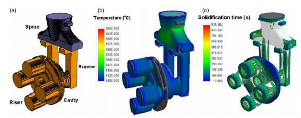 4 改進處理澆制體制的生物學摸具; b t = 2.26 秒低壓鑄造時熔融金屬材質生活的瞬態問題;c t = 252.6 秒的瞬態初凝景色